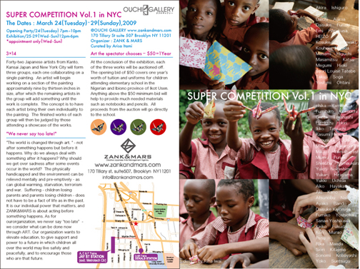 42 Japanese artists produce art work for African children in Nigeria, and all the proceeds from sales will be donated. A contribution in the amount of 50 dollars will go to school expenses and uniform fees, so that children can go to the elementary school for one year.